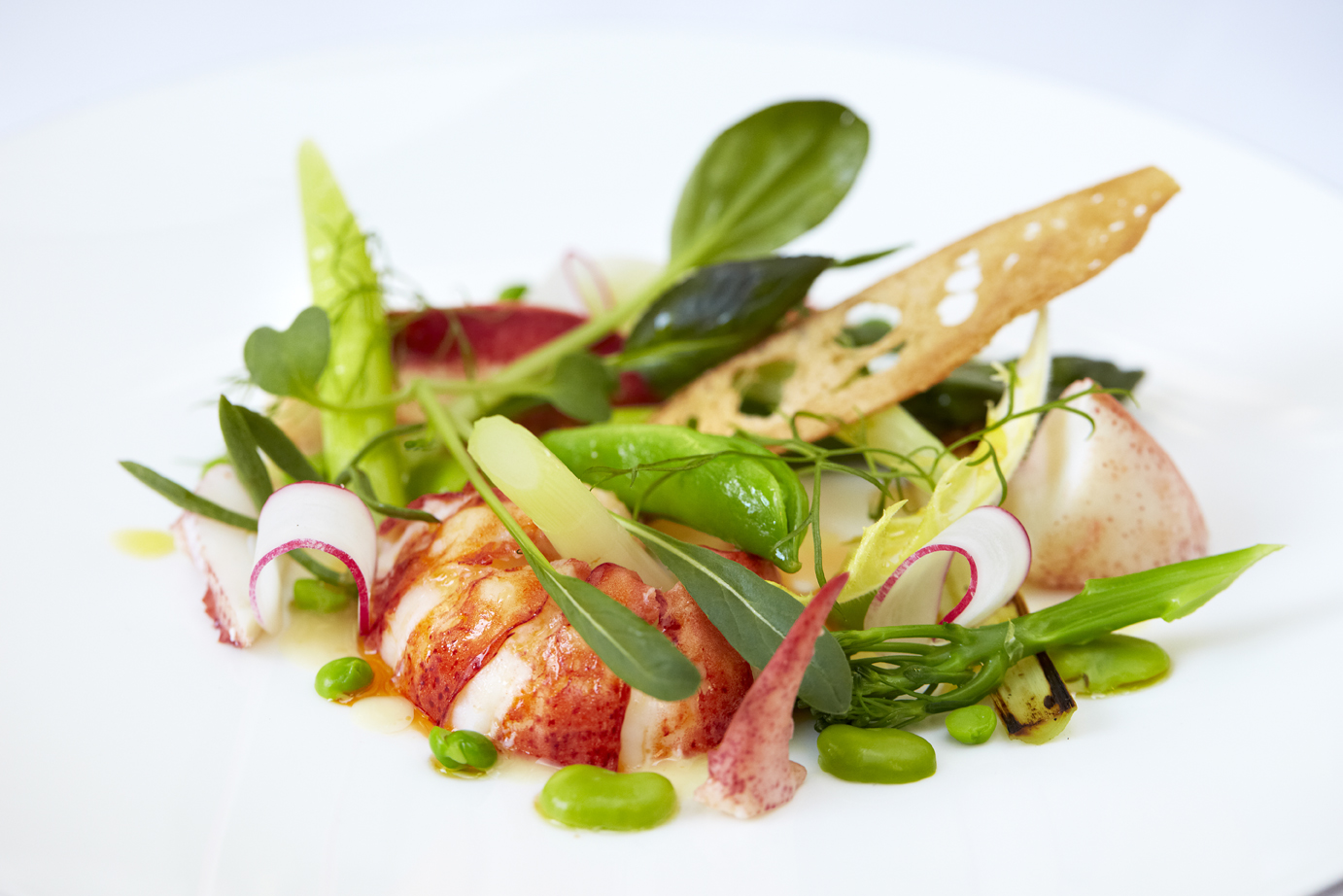 We just returned from London and enjoyed a sensational dinner there. The red lacquer hotel bar is THE spot to meet for a drink and see London’s prettiest people. And the cuisine in The Dining Room is superb–creative, light and bursting with flavors. We indulged in first courses of Eggs Drumkilbo; cured sea bream, pickled fennel, baby radish, lemon purée; and roast quail, pig’s trotter, seared foie gras, bacon, cider vinegar. What followed were luscious plates of dry aged rump cap, glazed ox cheek, caramelized onion purée, bone marrow, truffle; Salt Marsh lamb, sweetbread, grilled courgette, cauliflower, black garlic; roast Cornish cod, young fennel, leek, kedgeree, curry spices; roast Scottish halibut, buttered crab, seasonal vegetables, light crab bisque; and Telmara Farm duck, braised duck bun, glazed heritage carrots, chocolate porter. We made a note to try the fillet of beef Wellington on our next visit. Take a look at two of the artfully composed dishes, as pretty as a picture and sublimely flavorful: