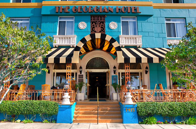 The iconic Georgian Hotel is one block from the ocean in Santa Monica and can’t be missed—look for the bright blue building with striped awnings and a sprawling porch just across from the pier and opposite Palisades Park. Built in 1933, The Georgian is full of personality and style and retains much of its Art Deco style.