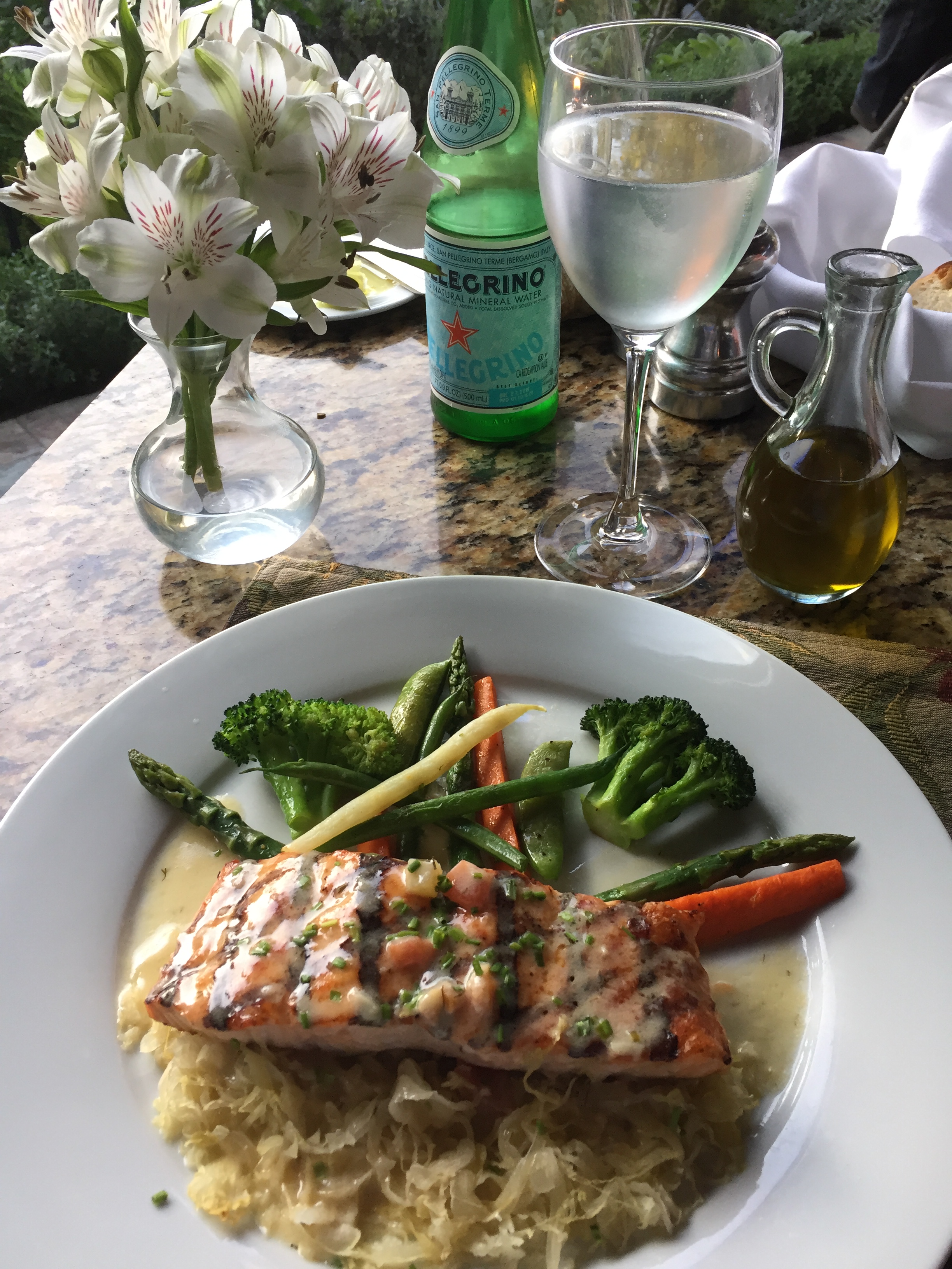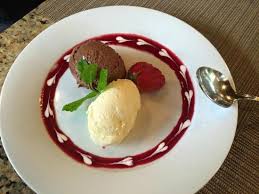 Our dinner began with a basket of excellent breads, always a barometer of an outstanding restaurant. Here, the butter thoughtfully comes at room temperature. A small Caesar salad had a sharp swagger. A crab cake drizzled with aioli was heavenly. Zucchini flowers stuffed with goat cheese were pretty to look at, bursting with flavor. Sauteed soft shell crabs were salty-sweet, tender-crispy enhanced by blood orange salsa. Grilled salmon on a bed of wilted sauerkraut and a dill beurre blanc sauce was a tantalizing play of flavors and textures. We ended the repast with refreshing home made vanilla ice cream partnered by a fruit crisp.