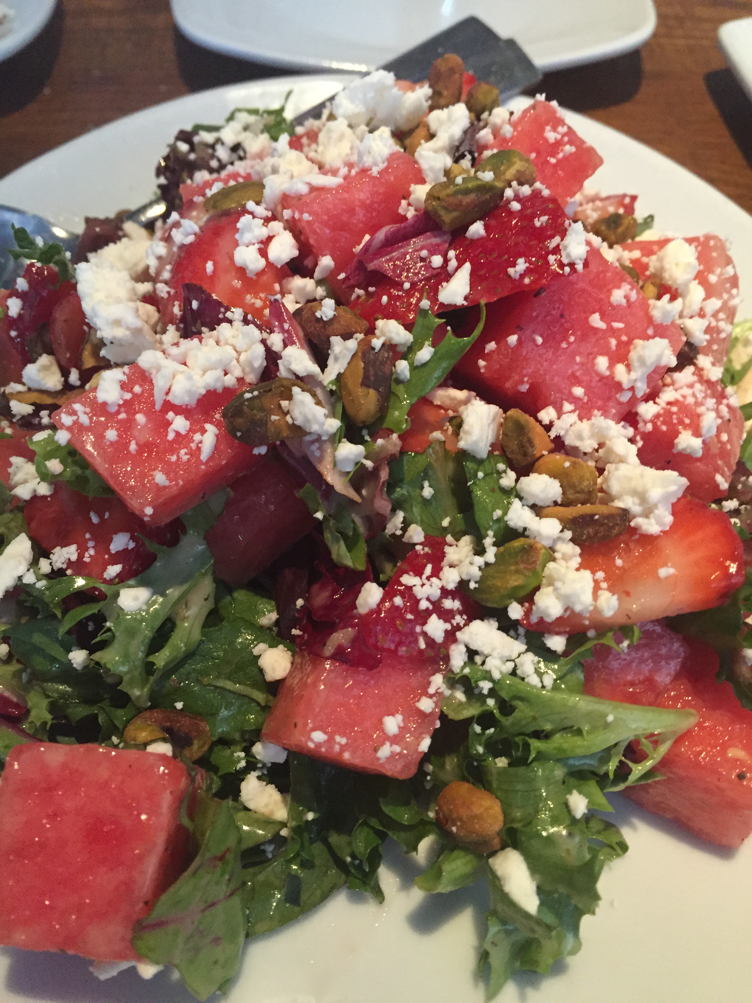 Then we ate a refreshing California Fields Salad chock full of fresh watermelon cubes, juicy strawberries and field greens, enhanced with a house- made vinaigrette, Feta cheese crumbles and California pistachios. A perfect summer starter.