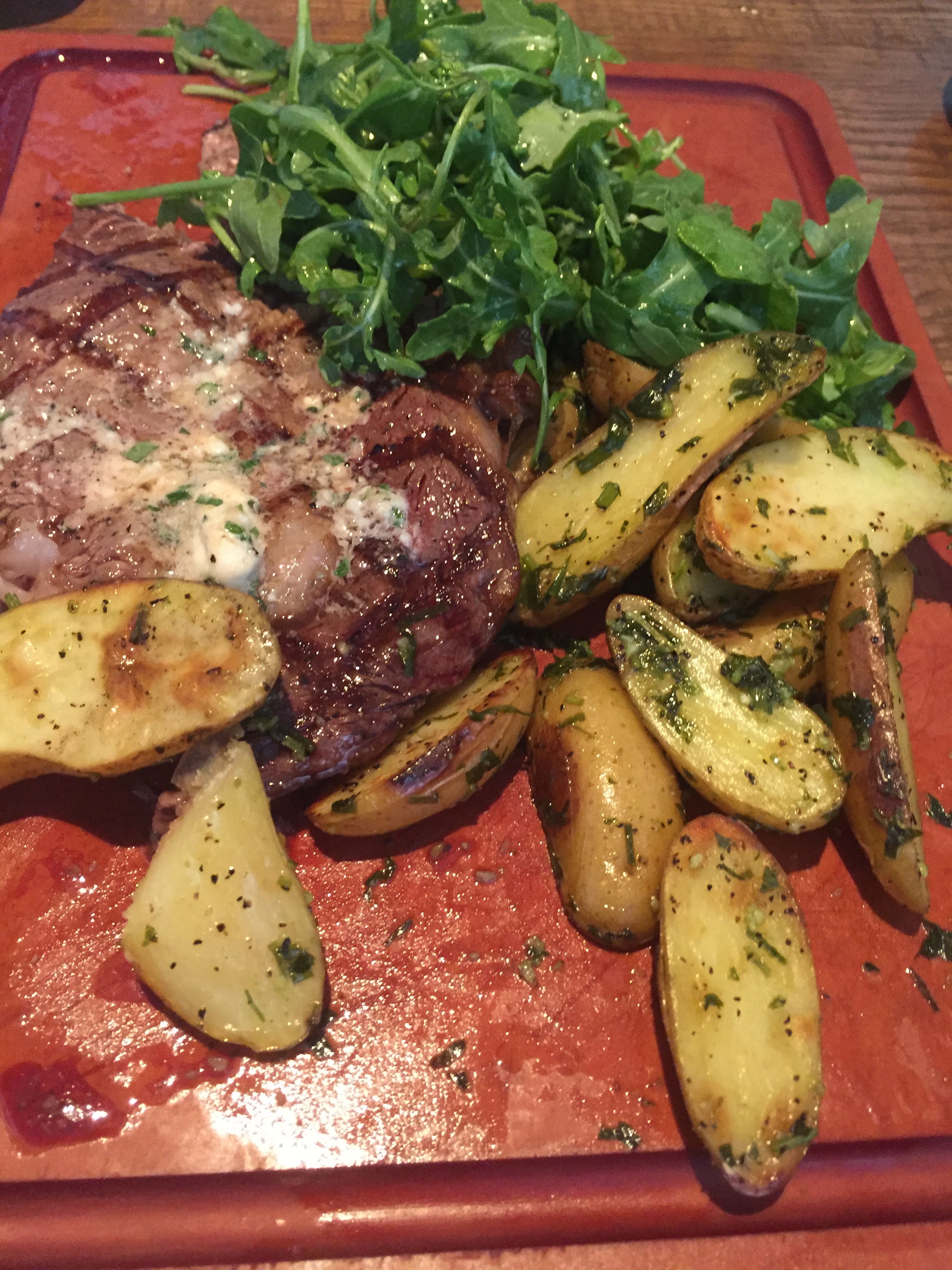 A sublime 12-ounce USDA choice ribeye grilled with Pinot Noir sea salt and dressed with creamy blue cheese butter was done to perfection. Served with browned fingerling potatoes and lemon garlic wild arugla, this dish a sensation of tastes and textures.