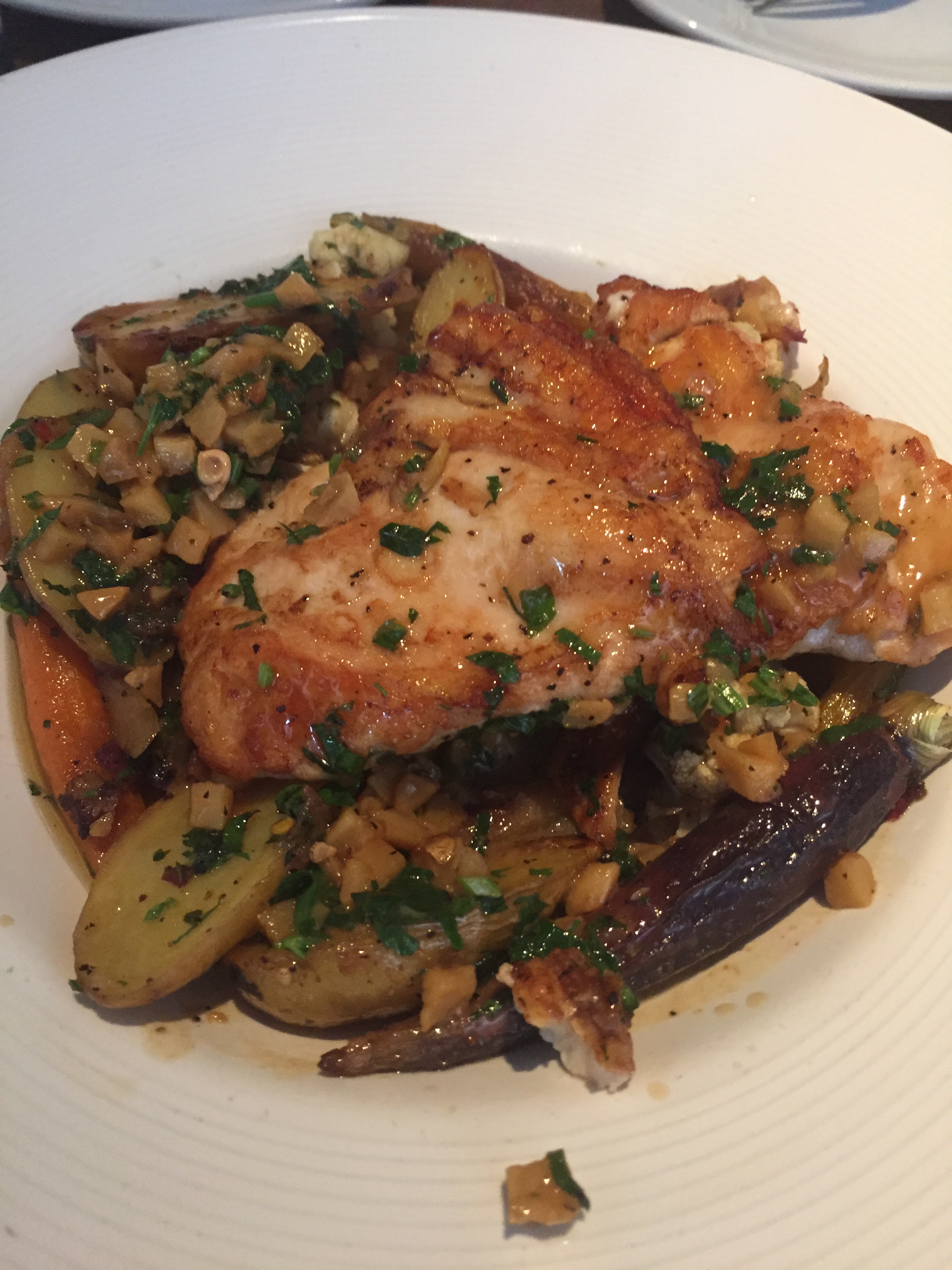 We then ate the moistest roasted garlic chicken with seasonal vegetables. The chef magically pan-sautéed high quality chicken breasts in a tangy lemon-garlic sauce, then plated them with hearth-roasted fingerling potatoes, cauliflower, Mediterranean herbs and seasonal vegetables and, voila, heaven.
