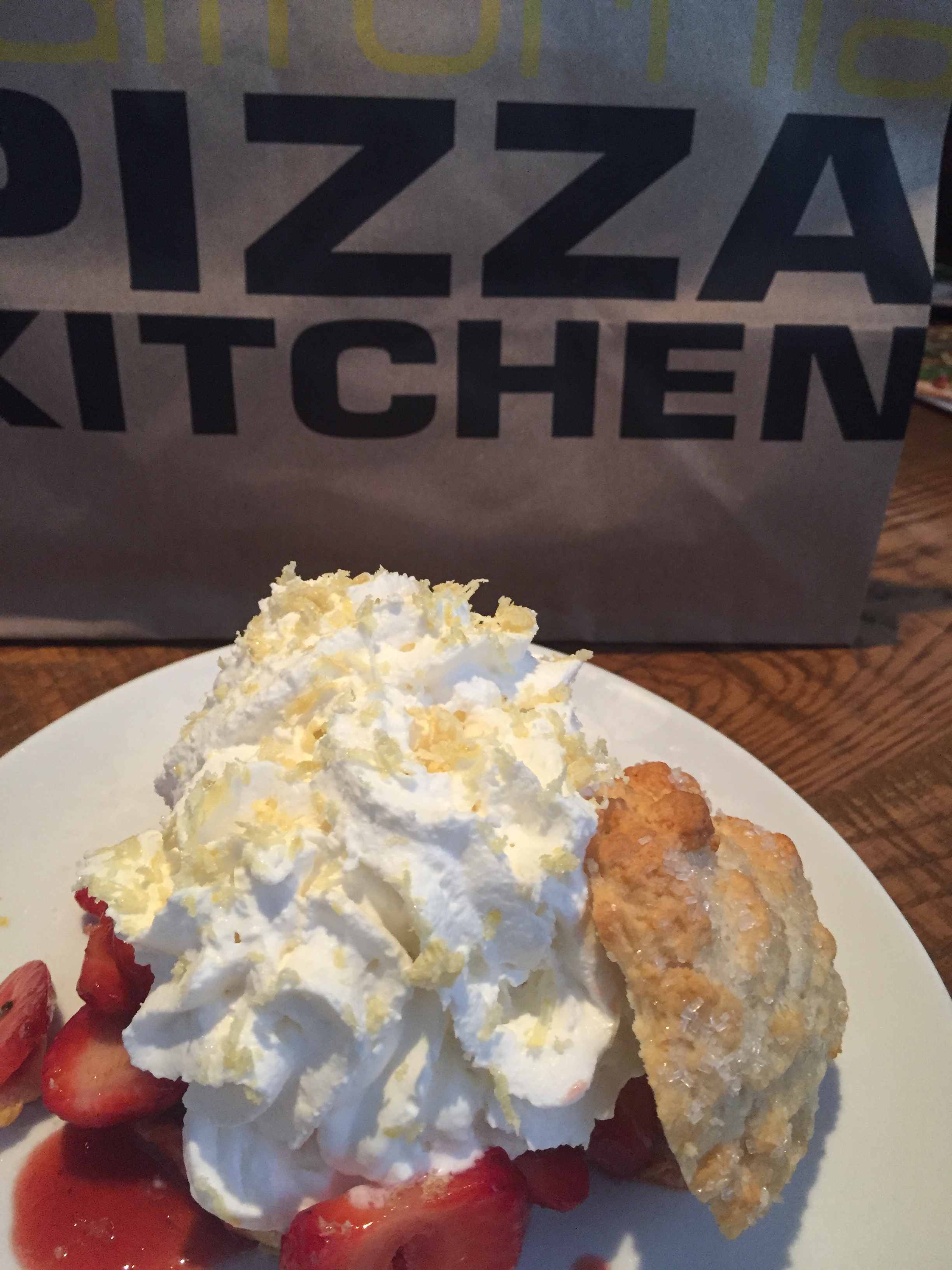 Our lunch finished on a high note: a beautiful seasonal strawberry shortcake–a fresh shortcake biscuit piled high with fresh strawberries, whipped cream and a house made candied lemon zest. Ours also came with a scoop of rich vanilla ice cream to boot.