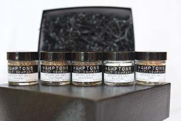 In addition, Hamptons Salt Company offers assortments of Hamptons Salt for the perfect hostess gift or foodie. Each collection comes in its own sleek black gift box. Collections include The Bartender, with Jalapeno, Lime and Lemon salt varieties ($59.99); The Flavor Seeker with five 1 oz. mini jars with Black Truffle, Garlic, Ghost Pepper, Smoked Hickory and Rosemary salt varieties ($39.99); The Daily Chef contains a 14 oz. jar of Cooking Salt, and 4 oz. jars of Finishing and Garlic salts ($44.99); The Connoisseur containing the four most luxurious salts Hamptons Salt sells including Fleur de Sel, Black Truffle, Porcini and Smoked Chardonnay Oak ($99.99); The Globe Trotter contains raw salts from corners of the globe including Himalayan Pink, Bali Pyramid, Cyprus Flake and Himalayan Black ($69.99); The Grillmaster with the most popular varieties perfect for the grill including Smoked Hickory, Smoked Mesquite and Espresso salt varieties ($59.99);The Collector includes 20 varieties of Hamptons Salt in mini 1 oz. jars ($149.99)