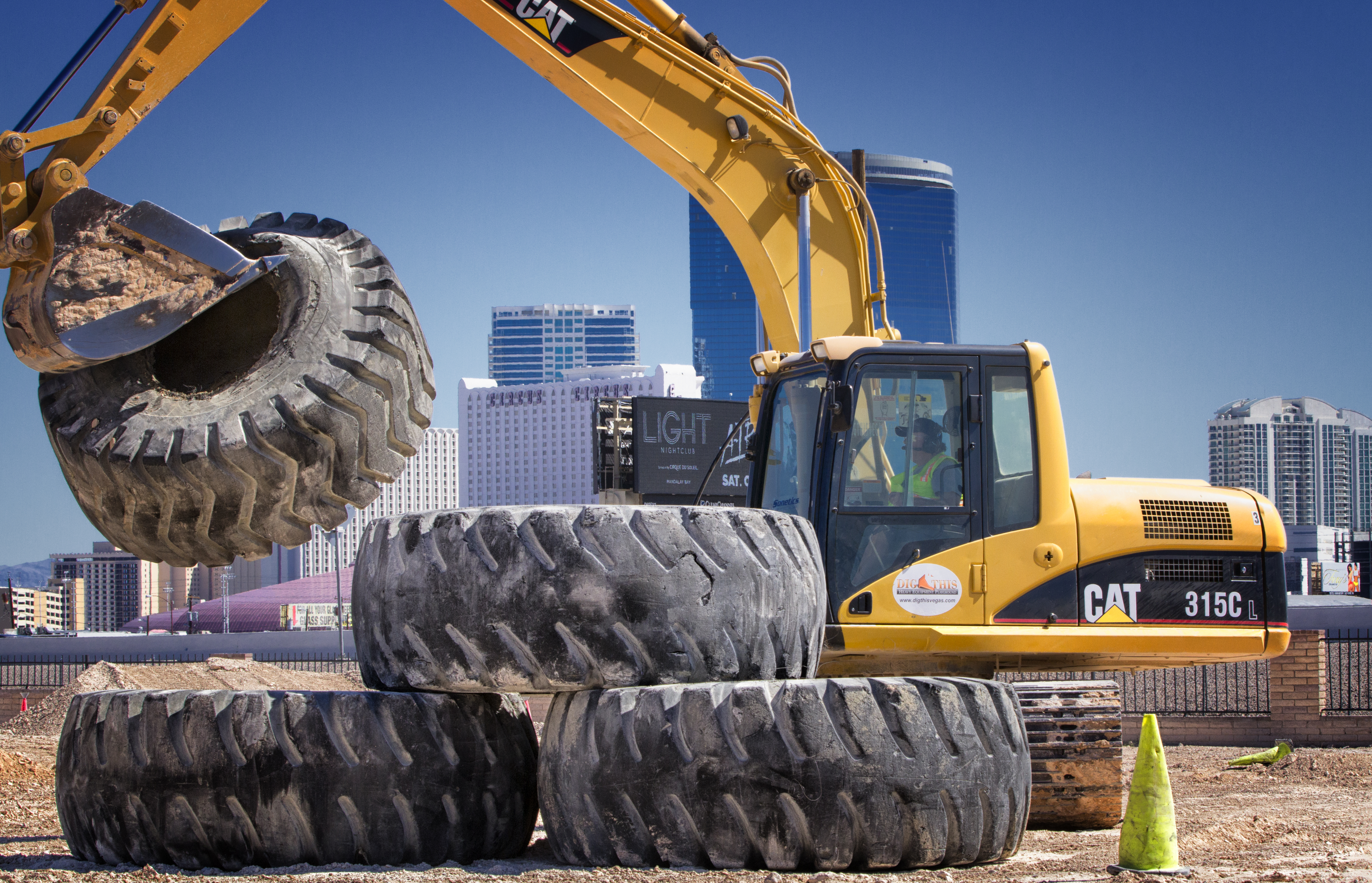 In Las Vegas we dug, pushed and lifted our way to a great deal of fun on Dig This’s massive 315C Excavators recently. We cannot imagine any way to have more fun in Las Vegas with your clothes on. After a safety orientation and warm up, we took the controls while our Dig This instructor guided us through a series of three exercises including building huge mounds, digging gigantic trenches, stacking 2,000 pound tires and playing Bucket Basketball.