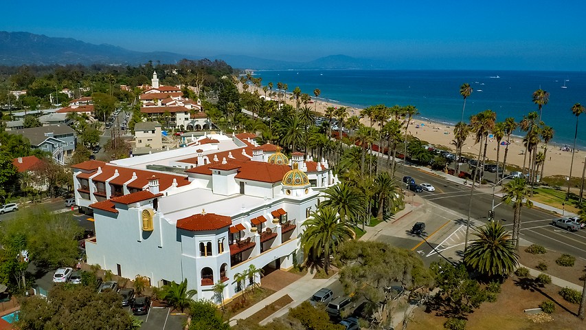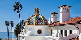 Framed by deep, red terra cotta roofs, luminous white stucco, gracefully arched windows and a duo of handcrafted tile domes, the Santa Barbara Inn perfectly embodies the spirit and architecture of its Santa Barbara. This is Spanish Mediterranean at its best: a sunny, tiled lobby with massive fireplace and stunning chandelier greets guests. We found the feeling totally residential and personal. Cars are politely valet parked.