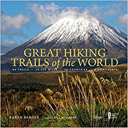 GREAT HIKING TRAILS of the WORLD: 80 Trails, 75,000 Miles, 38 Countries, 6 Continents by Karen Berger with a foreword by Bill McKibben, Rizzoli, embodies a hiker’s dream bucket list. This lavishly illustrated celebration of more than eighty of the world’s most iconic trails pays tribute to the most important, popular, and diverse hiking trails in the world inviting readers to take a walking tour through the planet’s natural wonders. Divided into six sections, the book groups trails by theme: pilgrimages, historic hikes, mountain hikes, wilderness trails, trails through diverse environments, and long-distance trails. From Mount Kenya to subarctic hikes in Scandinavia, and from exotic hikes in the Himalayas to more familiar trails in the United States and Canada, this book invites readers to explore the history, environment, and cultures of the world on foot. Each featured trail has its own section, with a map and photo gallery focusing on what makes it one of the most magnificent hiking trails anywhere in the world. Included are detailed descriptions and trail highlights. This is the perfect book for anyone interested in conservation, outdoor recreation, or the myriad ways that walking through a landscape is an intimate exploration of its soul.