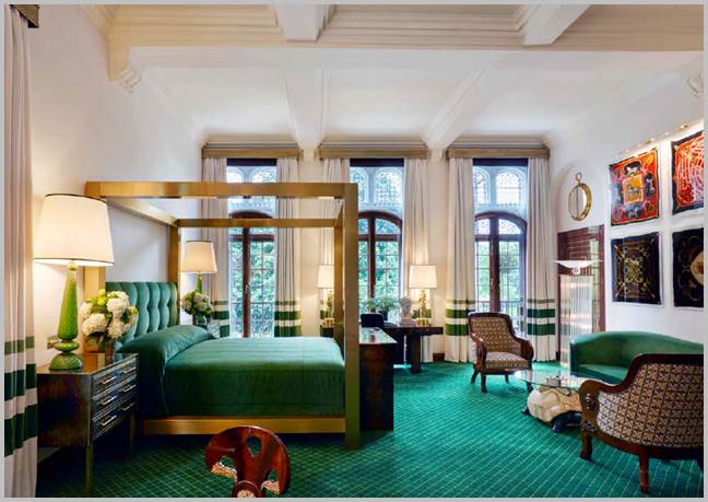 Carefully selected pieces of original period furniture harness the glamour of the room – at its center is an iconic bronze four-poster bed, and a distinctive vintage collection of Hermès scarves is framed and carefully presented on luxurious upholstered white velvet walls.