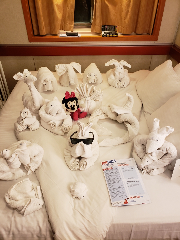 Returning to our cabin, we discovered one of those frequent, touching surprises Carnival is known for to make its guests feel special. The bed in our stateroom bore a menagerie of towel animals—at least 20 of them—making our toddler’s eyes pop out of her head.