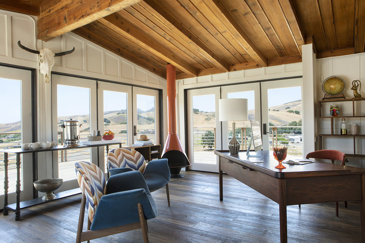 But change is coming to Los Alamos. We went there to check out Skyview, a modern boutique hotel reborn from an iconic 1950’s motel overlooking Los Alamos wine country. Set just off California’s iconic Highway 101, it offers 33 rooms, including two spacious suites and 16 deluxe rooms with fireplaces and private decks overlooking the rolling hills wine country. The five-acre hilltop property has its own full-service restaurant–Norman’s, a working vineyard, edible gardens and restored 1950’s-era heated pool.