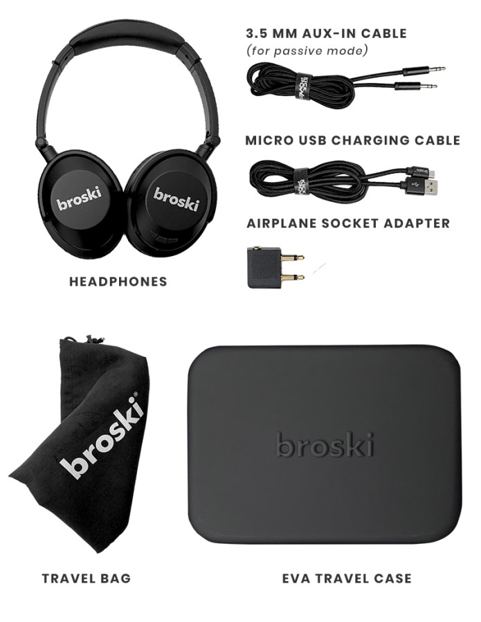 broski Lety Noise Cancelling Headphones to get away from the noise and immerse yourself into the music. These headphones have considerate memory foam and protein super soft leather to insure many hours of over-ear comfort for extended wear. They fold to fit into a zippered carry case (included) and their solid, lightweight structure makes them ideal for travel, sports and daily commutes. An aux cable and an airplane audio adapter are also included.
