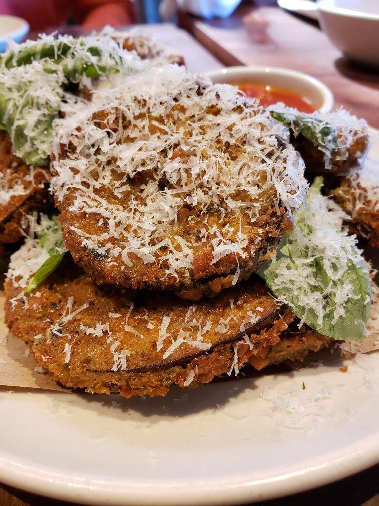 Warm marinated olives arrived in a pool of garlic and rosemary. Fried eggplant with harissa sauce and parmesan was crunchy.