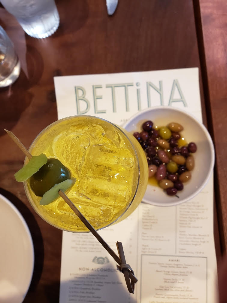 We started our Bettina experience with a few aperitivi: a white Negroni made with Bordiga vermouth bianco, prosecco and Suze bitters and gin refreshed us. Then a cocktail called an Italicus of Plymouth gin, bergamo liqueur and soda put us in the proper mood for food.