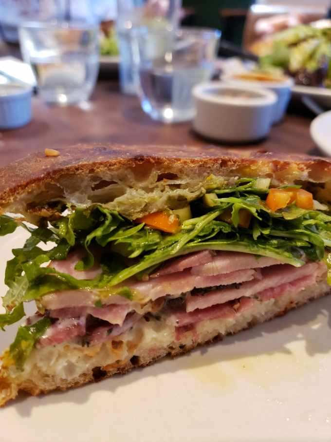 We did not stop there. We ordered a memorable meatball sandwich on house foccacia, a happy marriage of mozzarella and harissa tomato sauce and a satisfying Porchetta sandwich with house ricotta, salsa verde, pickled onion and arugula. A refreshing baby gem salad with ranch dressing, pickled onion and goat cheddar rounded out the meal with glasses of vino blanco for all. For a small restaurant, Bettina has an impressive wine list with 18 whites and over 20 reds, all imported plus a roses, sparklers and, of course, cocktails.