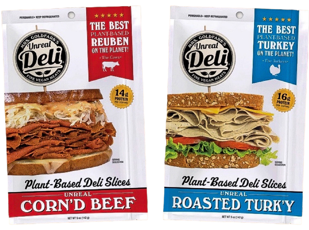 Turkeys can thank Mrs. Goldfarb for her scrumptious cruelty-free Unreal Roasted Turk’y deli slices. Although they are made with organic white beans, corn, celery, onion & mushrooms, this line-up of nutritious ingredients tastes surprisingly similar to real turkey deli slices. All plant-based ingredients, not concocted in a lab, make biting into a stack of Unreal Roasted Turk’y deli slices laced with creamy vegan mayo and some cranberry sauce the best thing that ever happened to a couple of slices of bread, and to your body. Each 2 oz. serving of Unreal Roasted Turk’y deli slices has 16 grams of healthy protein, which is more protein than the 12g found in a 2 oz. serving of real turkey deli slices. You can sink your teeth into a serving of Unreal Roasted Turk’y deli slices guilt-free because they only have 0.5 g of fat per two oz serving, versus 3.5 g of fat in a 2 oz serving of real turkey deli slices. Unreal Roasted Turk’y deli slices are a bit dry, but so are real turkey deli slices, and a creamy vegan mayo or aioli, tomatoes, and avocado is a delicious and mouth-watering way to remedy that problem. By the way, Mrs. Goldfarb, whose family was in the real-deli business for 100+ years, is a working mother of 3, running 2 manufacturing plants, with a goal of proving that the finest deli requires no compromise. This product is Peta-approved. https://unrealdeli.com/