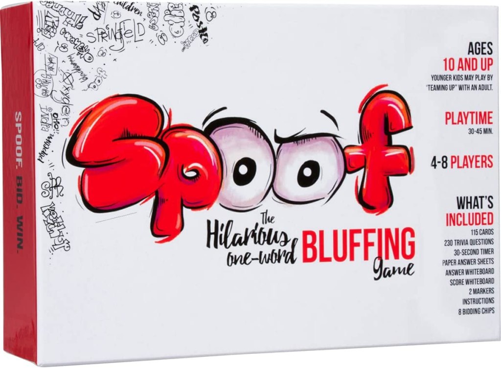 SPOOF, a hilarious bluffing game, is for 4-8 players ages 10 and up. Easy to learn, quick to play and loads of fun, SPOOF guarantees a full night of fun as players try to figures out who is right and who is trying to fool you by creating “wrong” answers. An Inspiration Play game.