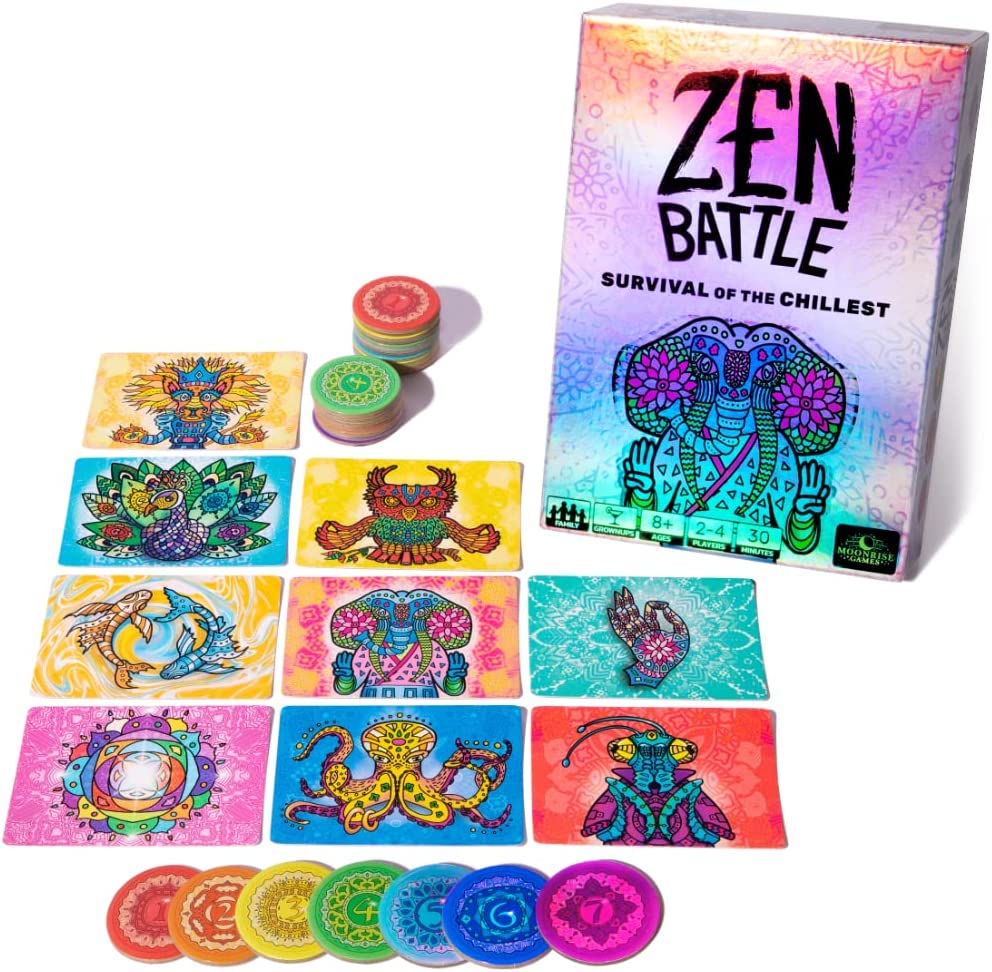 Zen Battle, Survival of the Chillest, is a card game for 2-4 players, ages 8 and up, that has players compete to transcend by aligning their Chakra cards from #1 to #7 to become the ultimate master. It is quick to learn and a blast to play. A Moonrise game.