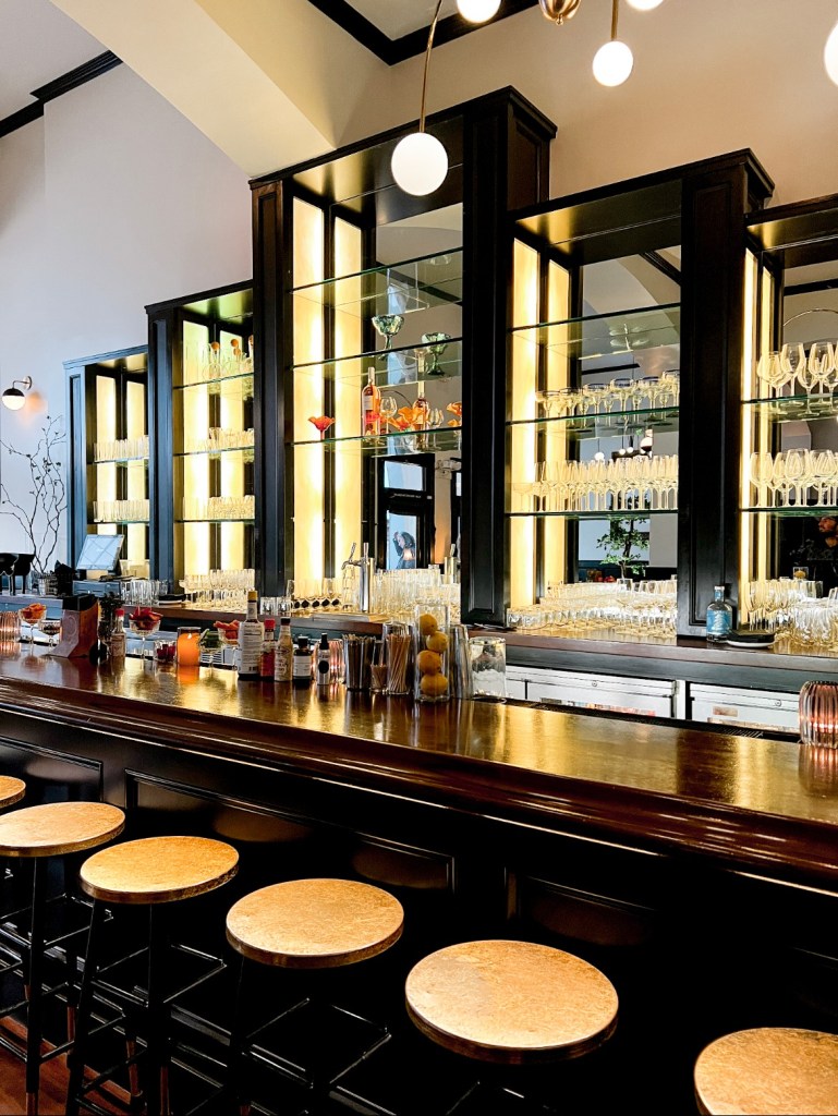 The Black Sheep occupies a soaring two story space in a building that boasts a rich history of French restaurants and saloons dating back over a century. You can ascend stairs and sit in the balcony overlooking the restaurant if you like a bird’s eye view with your meal or cozy up in a soft banquette or large table by the windows. The very talented Kelly Jo Frazier has done a great decorating job in crisp Deco-inspired shiny black and mirrors. A long handsome bar provides seating for those who eschew a table. Candlelight warms the rooms.