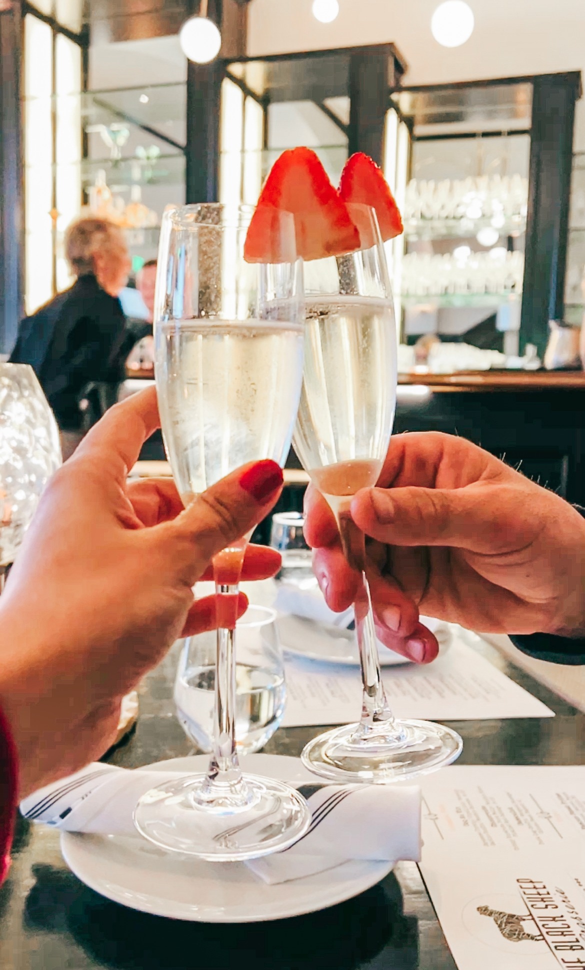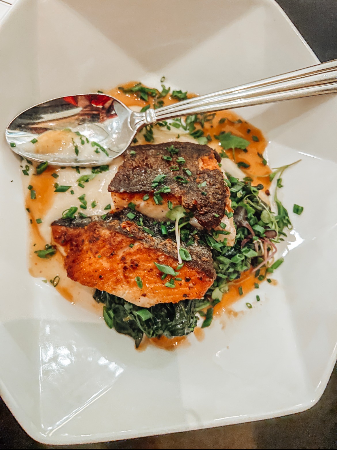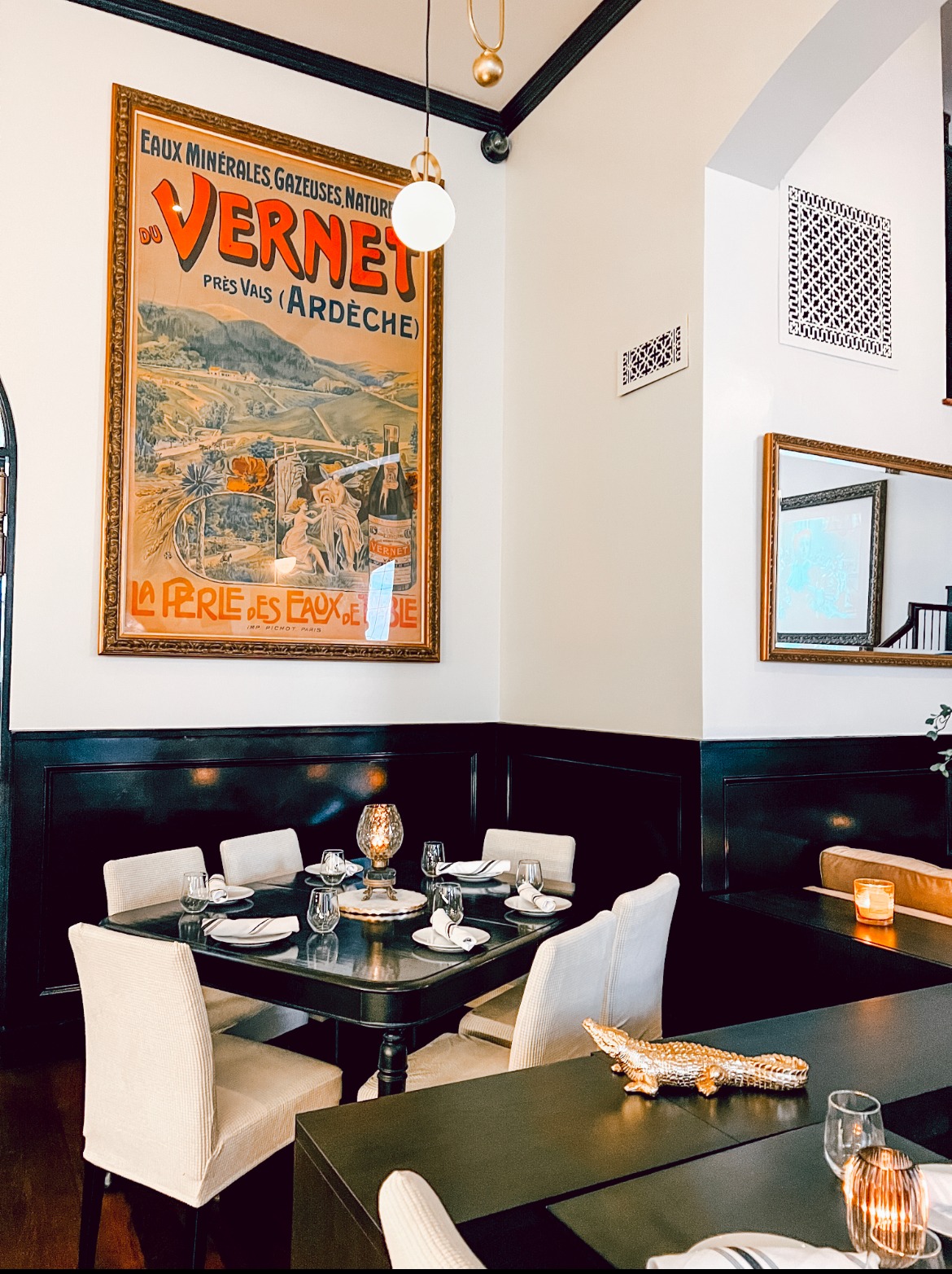 The Black Sheep occupies a soaring two story space in a building that boasts a rich history of French restaurants and saloons dating back over a century. You can ascend stairs and sit in the balcony overlooking the restaurant if you like a bird’s eye view with your meal or cozy up in a soft banquette or large table by the windows. The very talented Kelly Jo Frazier has done a great decorating job in crisp Deco-inspired shiny black and mirrors. A long handsome bar provides seating for those who eschew a table. Candlelight warms the rooms.