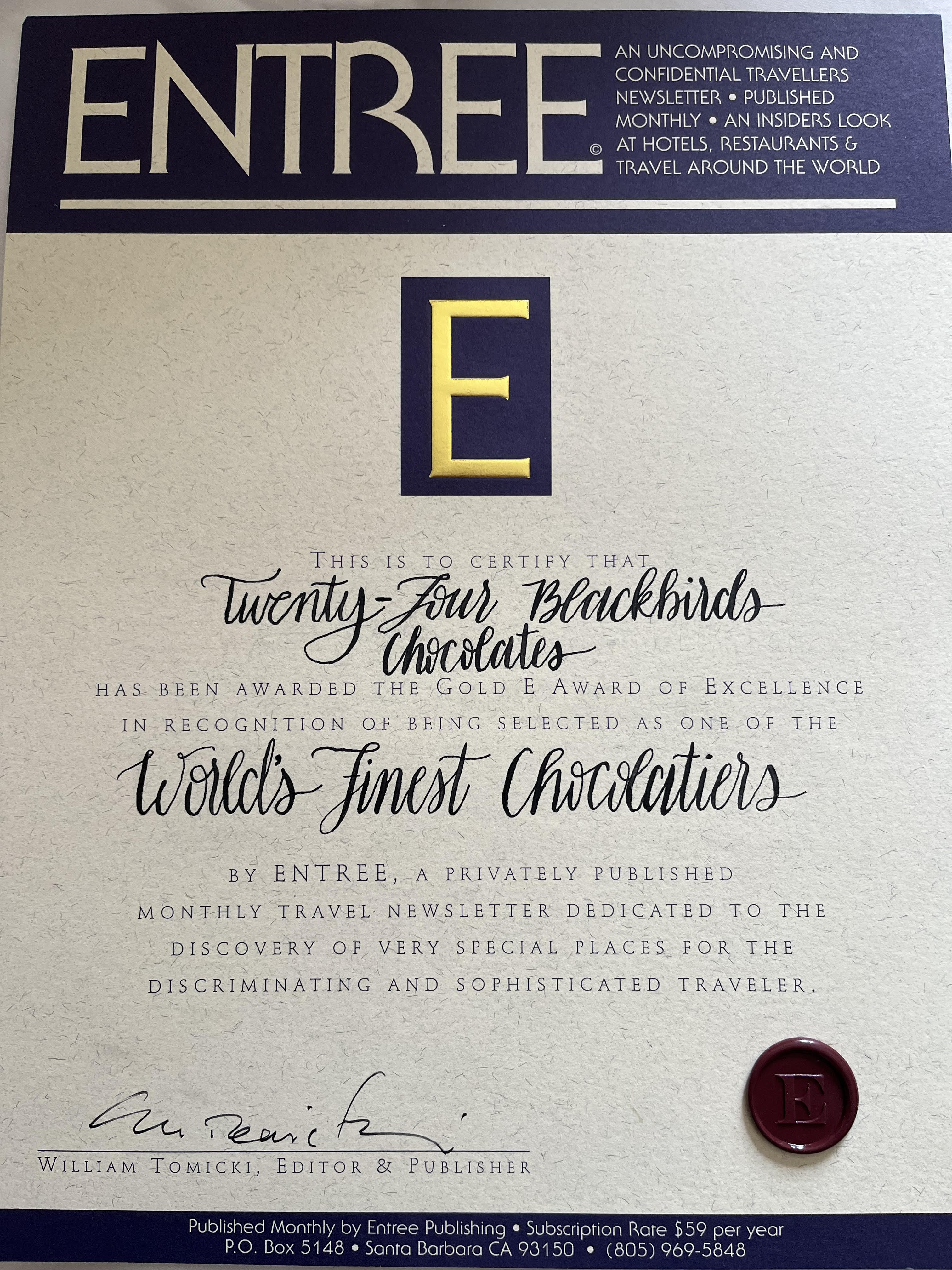 Santa Barbara is a beautiful city that seems to attract distinguished artisans with zealous devotion to their craft. Mike Orlando is a prime example. Mike is a chocolate maker and chocolatier, a connoisseur recognized as one of the finest in the country, and in a small building on East Haley Street, he and his dedicated team hand-fashion chocolate bars and truffles of the highest quality known by a small coterie of discerning enthusiasts as the unrivaled example of inimitable elegance and taste. We are quite enthusiastic about Twenty-Four Blackbirds Chocolates and have awarded them ENTREE’s highest honor, our Golden E of Excellence.