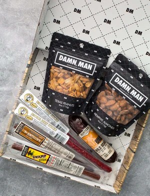 Charcuterie meat, nuts and cheese from DAMN, MAN: snacks guys love like their hot and spicy sausage bites, bacon cheddar cheese, premium summer sausage, almonds, peanuts, jerky and meat sticks. Adventurous snackers will go wild for them this perfect gift which can be custom created for your man’s carnal instincts. https://dmsnacks.com/