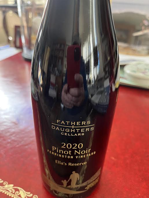 FATHERS + DAUGHTERS CELLARS’ 2020 Pinot Noir, Ferrington Vineyard, Ella’s Reserve, a focused floral ruby red beauty with intense aromas of cranberry, strawberry jam and bramble mix with violets and rose petals. We tasted intense bursts of pomegranate, black cherry and plum mix with earthy components of tobacco leaf and black tea. Smooth tannins with vibrant acidity providing a long finish. This is their signature wine, 20 months in French oak barrels. This wonderfully rounded wine would be a match made in heaven with veal, pork, poultry and mushrooms. A steal at $55. See http://www.fanddcellars.com for more on this extraordinary winery and their offerings, the magic of winemaker Phil Baxter, Jr.