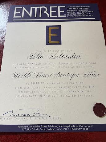 We are honored to present the Villa Vallardin with ENTREE’s Golden E of Excellence, our highest award.