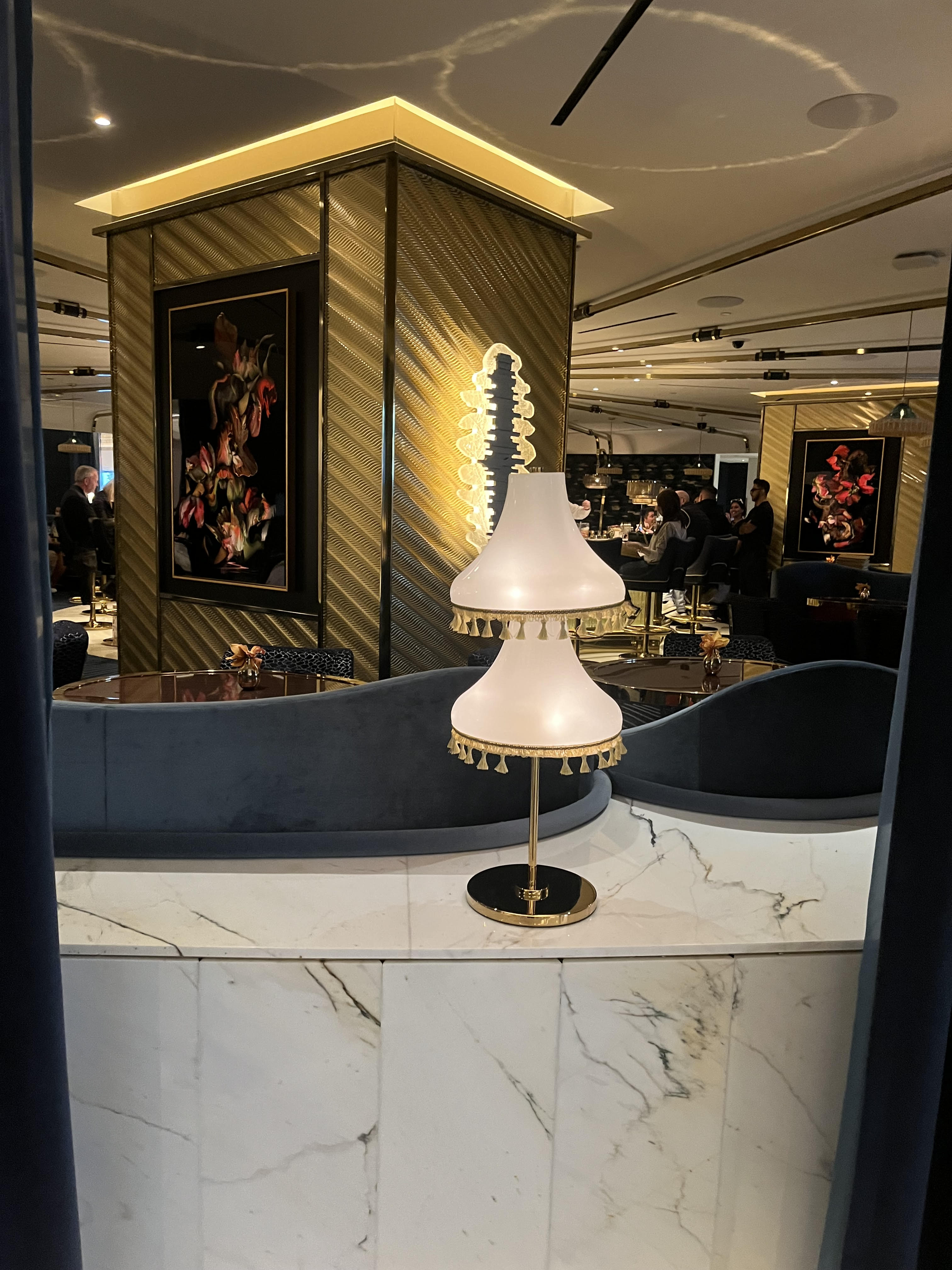 Our rooms were very luxuriously large and filled with natural light and views of The Sphere, which has to be seen to be believed. An enormous globe, it serves as an entertainment venue inside and outside, a beacon of constantly morphing colorful and dramatic graphics. Beds, linens, art, housekeeping and amenities at the Fontainebleau are innovative and tasteful. Italian shampoos and conditioners by Bottega in sapphire, jewel-like blue bottles look like faceted precious sapphires crowned by gold–incised caps. Bathrooms are huge. And we appreciated the fact that Fontainebleau’s cutting-edge technology did not make things difficult—light fixtures, thermostat, electronic drapes—all were easy to understand.