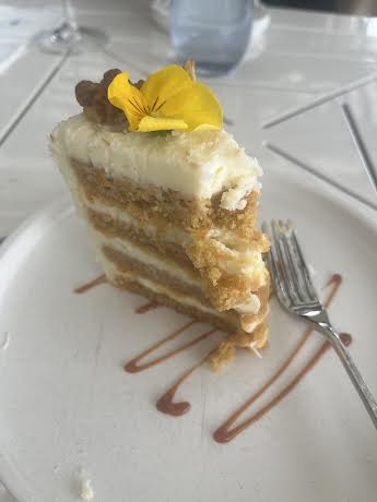 Out lunch ended with a delightful carrot cake, four decadent layers of yummy, carroty goodness, topped with a sweet frosting and a yellow pansy.