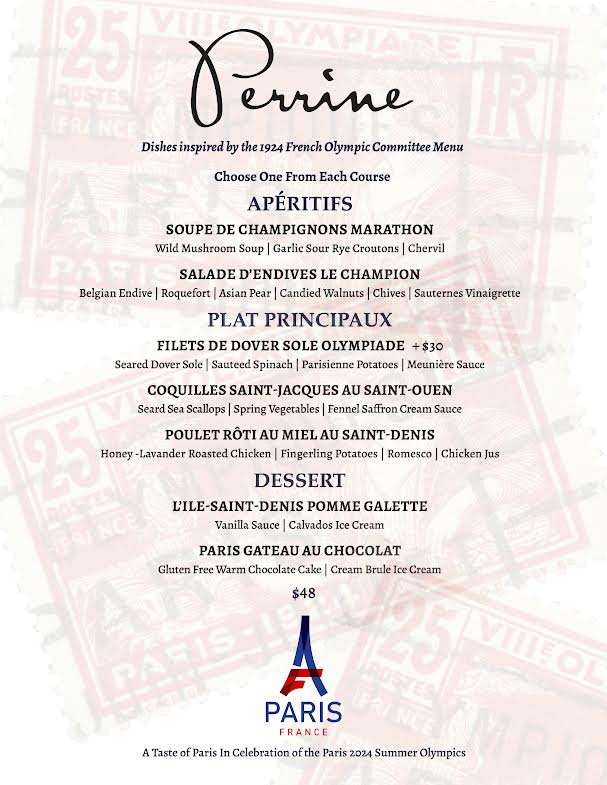 In honor of this auspicious occasion, The Pierre NY’s Executive Chef/Culinary Director, Michael Mignano has created a special prix-fixe menu for French-inspired Perrine NY. Inspired by the 1924 French Olympic Committee Menu, the three-course menu will feature such revered French delicacies as Soupe de Champignons Marathon, Salade d’Endives le Champion, Coquilles Saint-Jacques Au Saint-Ouen, Filets de Dover Sole Olympiade and Poulet Roti au Miel au Saint-Denis. For dessert, diners can select from L’ile-Saint-Denis Pomme Galette and Paris Gateau au Chocolat.
