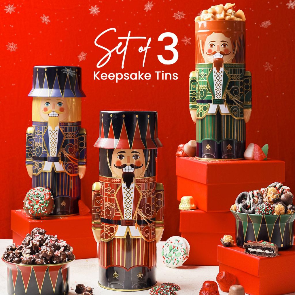 -Sweets and Soldiers Assortment- Sink your Claus into this magical bundle of 3 Nutcrackers stuffed like stockings with festive snacks to surprise those of all ages. Peek inside to discover sweet wonders including festive caramel popcorn, chocolate covered Oreos, and classic peanut brittle. Deck the halls with sweets that are sure to become a new holiday tradition.