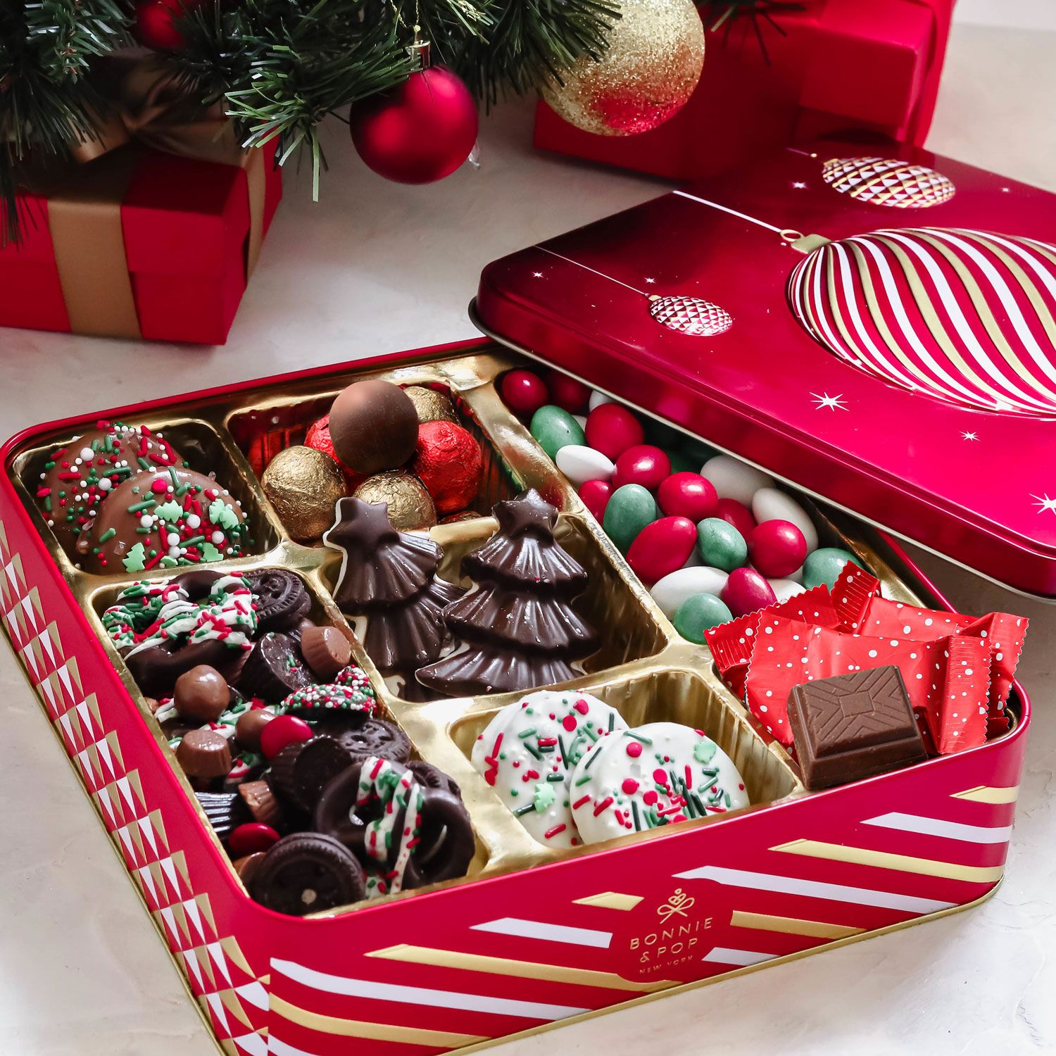 -Holiday Jingle and Joy Assortment- Unwrap the Magic of Christmas with our shiny red ornament gift Tin! Overflowing with holiday delights like belgium hazelnut truffles, candied chocolate almonds, and chocolate covered Oreos, it is the perfect present to spread sweet festive joy!