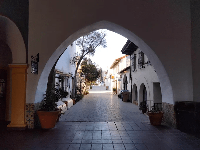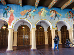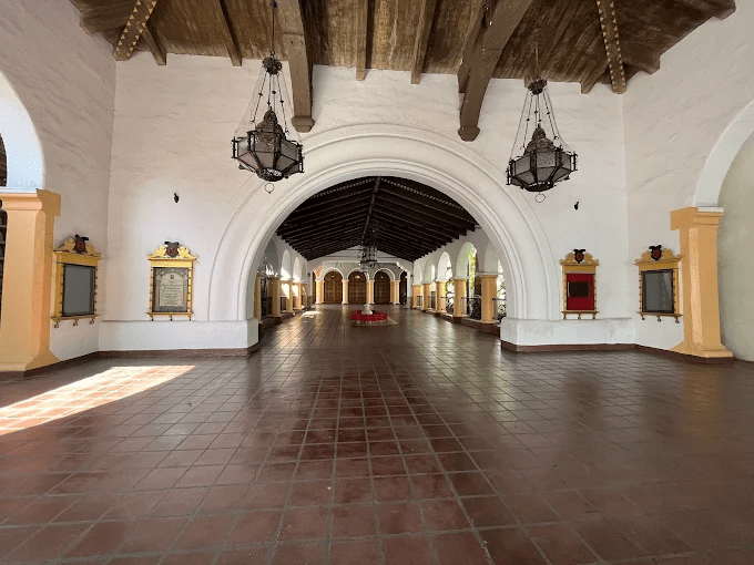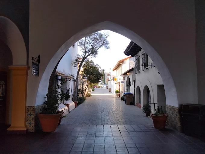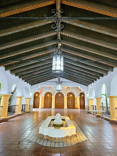The theatre has a relatively small lobby, however the building is set half a block back from State Street street with an outdoor covered lobby (“the Paseo”) providing lobby and circulation space. Other theatres of the time which were built with these “courtyard” lobbies were Grauman’s Egyptian Theatre and Chinese Theatre in Hollywood, the Fox Fullerton and the Geffen Playhouse (completed 1929 as a masonic lodge). The Arlington is the only one of these theatres to have a covered exterior lobby, the sidewalls being open with large Spanish arches. In the center of the Paseo is a tiled fountain as would have been found in smaller Spanish villas of the time.