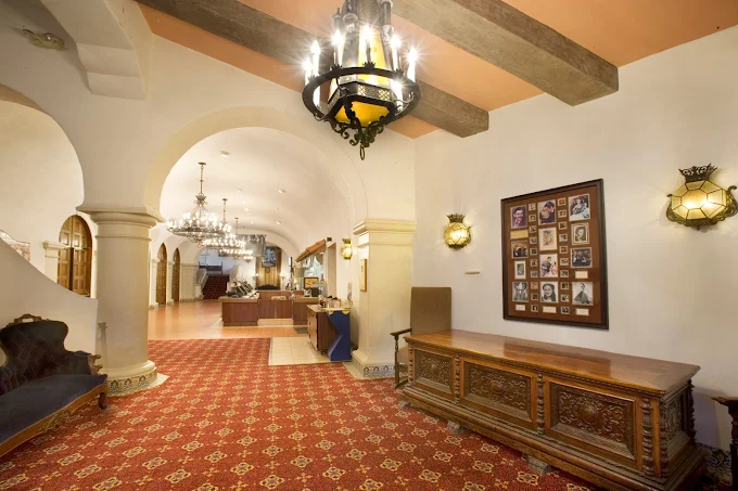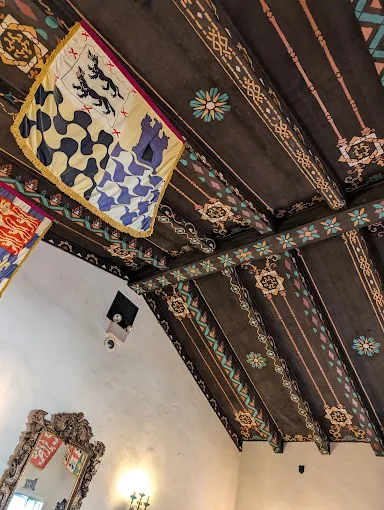 The interior lobby features a vaulted ceiling with handmade Catalonian chandeliers. The steps to the balcony, at either end of the lobby, feature ironwork balustrades/handrails and glazed Tunisian tiles. The lounge, at the house right end of the lobby, is a large apex-ceilinged room hung with flags inspired by Spanish heraldry, including the coat of arms of Spain and the coat of arms of Castile and León. The lounge’s ceiling features mock wooden rafters, brightly painted with Spanish-inspired patterns.