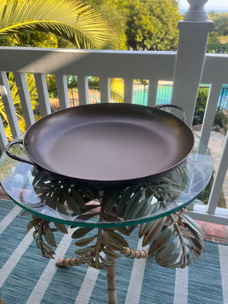 This extraordinary paella pan handcrafted by Smithey Ironware of Charleston is a work of art. It could well be on display in a museum because of its lines, perfect execution and design aesthetic. Fortunately for us, it occupies a place of honor in any kitchen fortunate enough to have one. Not only is this pan beautifully made, it performs like a star, a superior start to any paella.