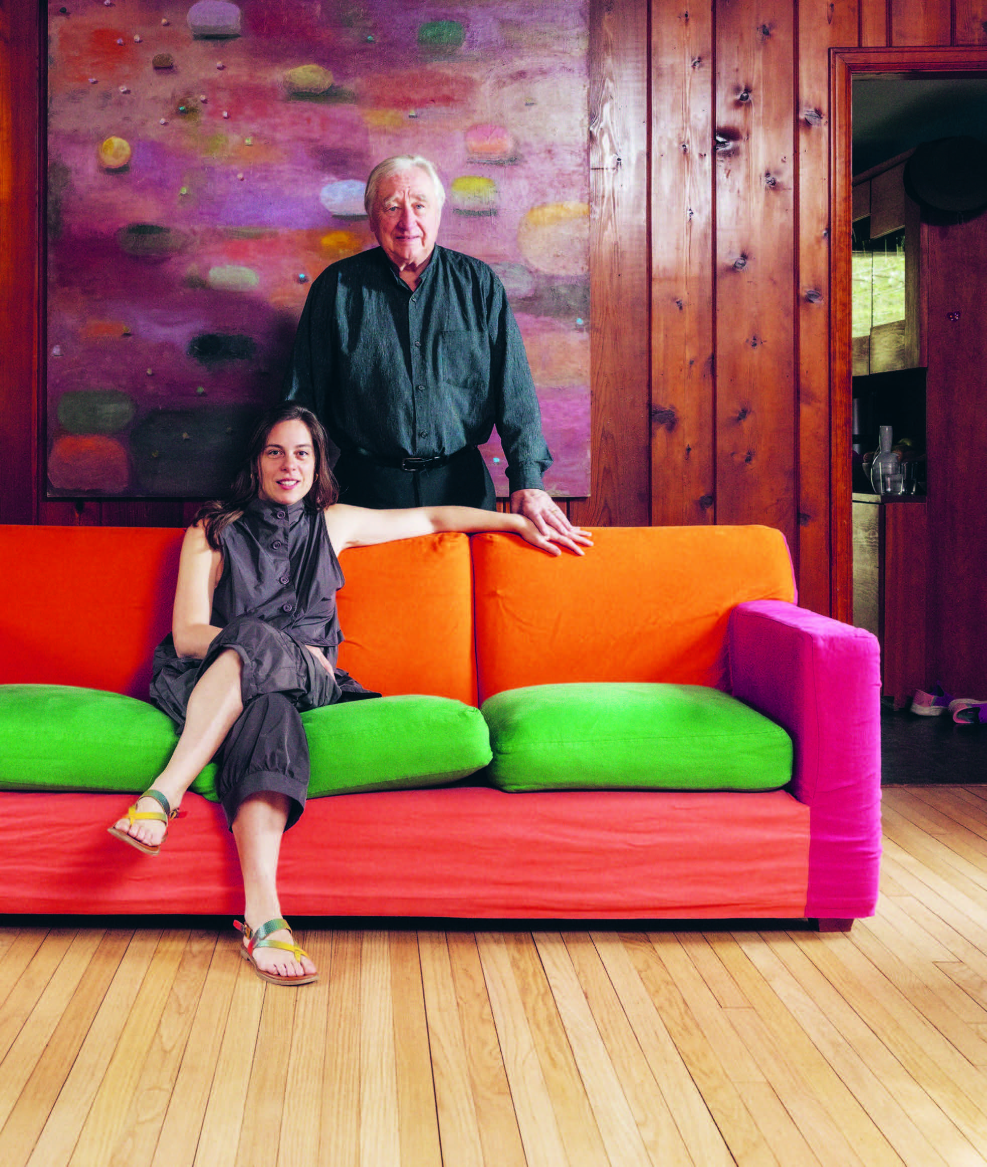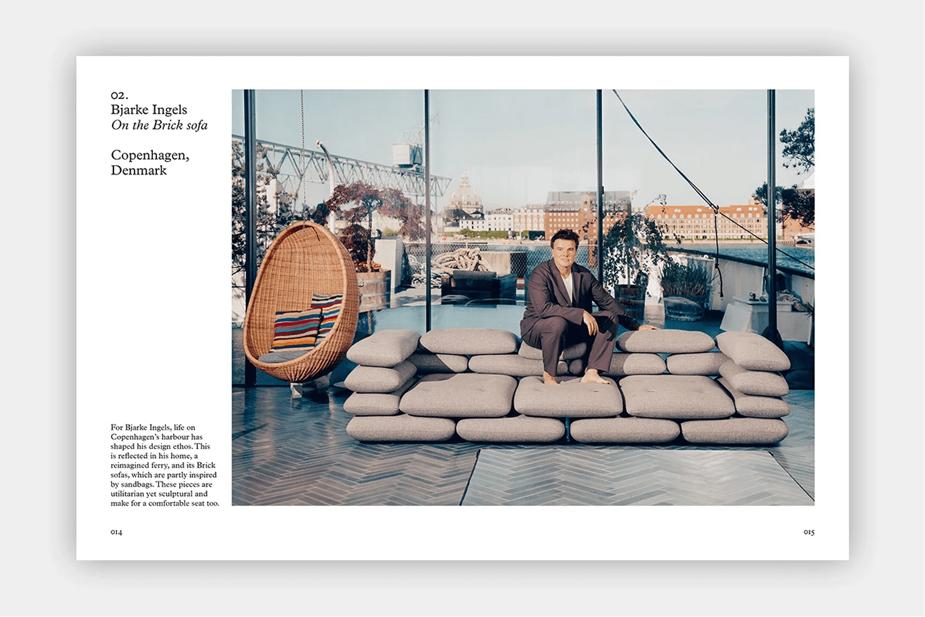 Each entry showcases a photographic portrait of the designer on their sofa, taken at their home or workplace—sometimes with their family, pets, and children—and explores their sofa choice: whether or not they designed it; if not, who did, and why they chose it; and how a particular sofa aligns with their lifestyle and design philosophy.